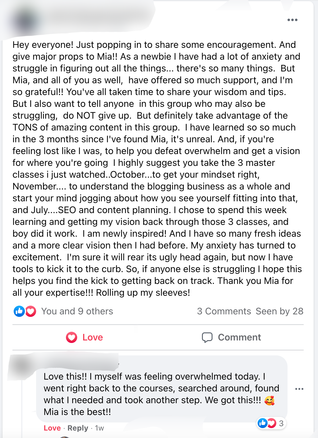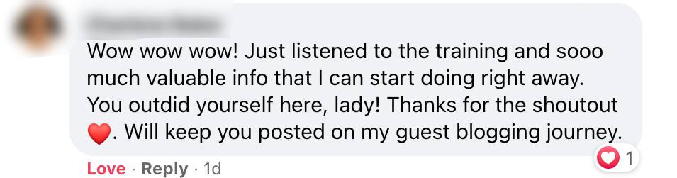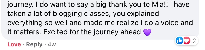 Having the Facebook support group is invaluable. I’m a part of other Facebook groups, where you never see the owner. Mia is incredibly active in the group and actually takes the time to answer every question! It’s nice having constant support, you never feel alone in the blogging world!